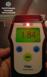 Так, 21 серпня близько 23-ї години на шляху М-12, поблизу аеропорту «Тернопіль» патрульні зупинили «Ford Fiesta», що порушив правила дорожнього руху. Спілкуючись із кермувальником інспектори помітили ознаки сп’яніння. Водій не став приховувати, був на святкуванні, вживав алкоголь. А скільки, показав алкотестер – 1,84 проміле у крові.
