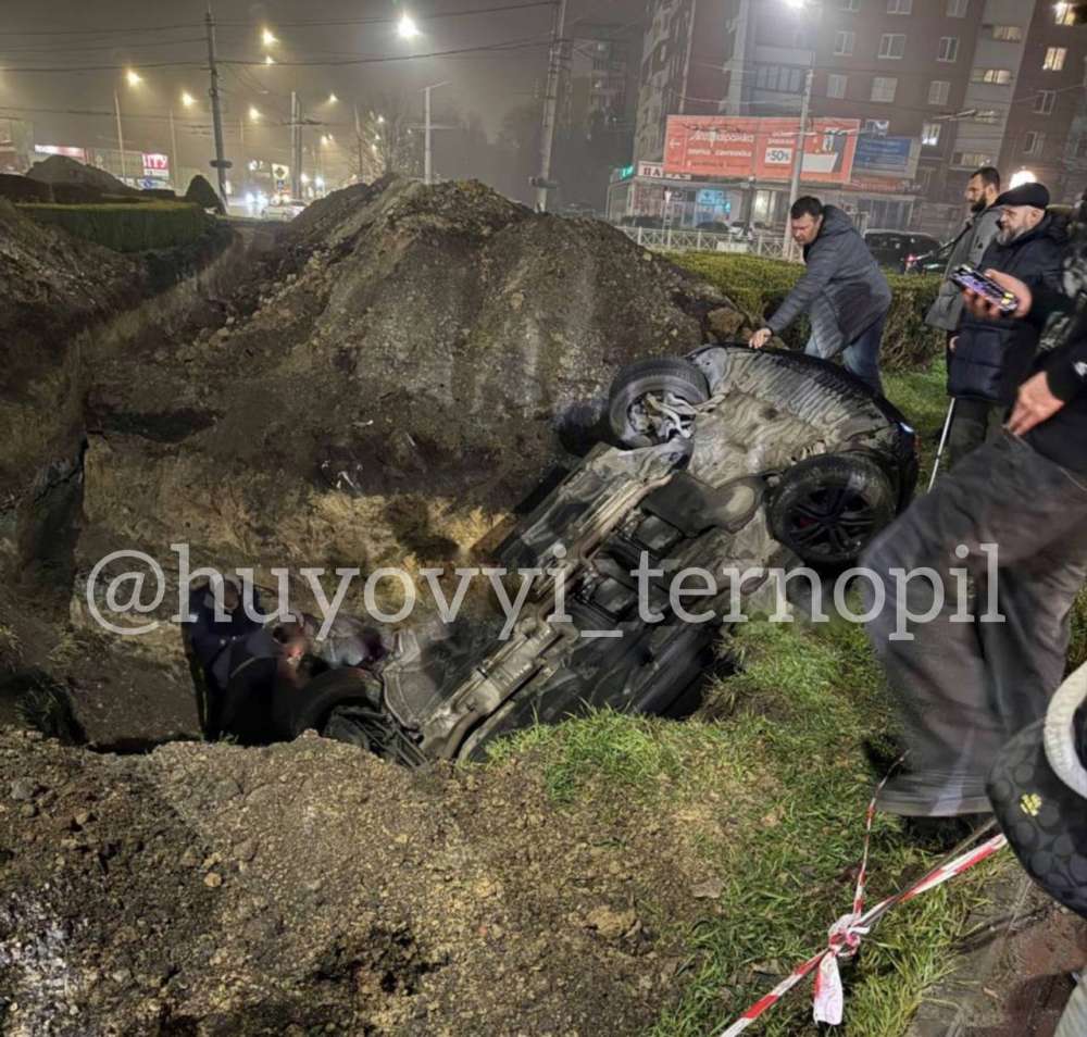 Аварія на Збаразькому кільці у Тернополі: авто перекинулося в виритий котлован