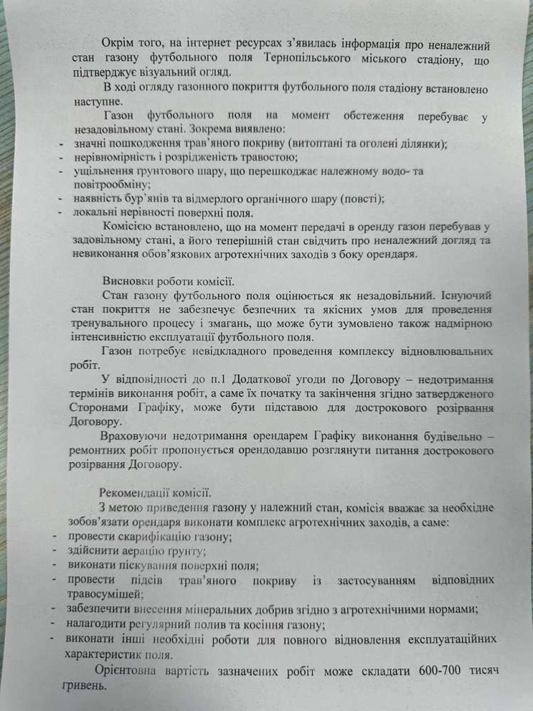 Стан покриття не забезпечує безпечних та якісних умов для проведення тренувального процесу і змагань — це не оцінка чиновників, це висновок комісії із залученням фахівця з догляду за газонами. Орієнтовна вартість відновлення — 600–700 тисяч гривень. За рахунок кого має оплачуватись ця сума, якщо збитки нанесено орендарем?