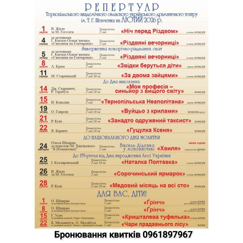 «Поки на вулиці лютневі морози, у стінах нашого театру — справжні емоційні «тропіки»! Цей місяць обіцяє бути насиченим: від безсмертної класики до сучасних провокаційних постановок. Плануйте свої вечори заздалегідь, адже квитки розлітаються швидше, ніж кава у театральному буфеті! Початок вечірніх вистав о 18:00. Початок дитячих вистав о 13:00. Квитки в касі театру та за номером 0961897967», – йдеться у повідомленні.