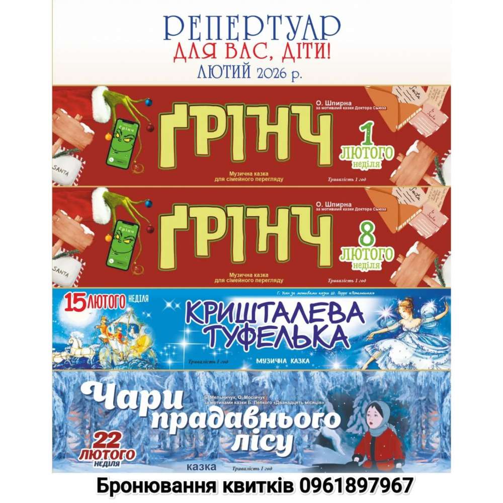 Серед пропонованих вистав для дітей – «Грінч», «Кришталева туфелька», «Чари прадавнього лісу».