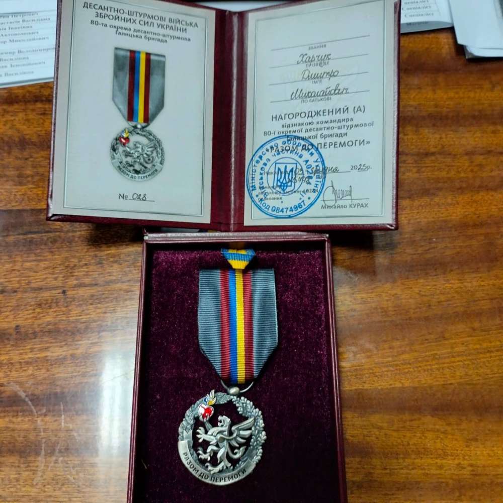 Виконувач обовязків директора Ветеранського простору Тернопільщини Дмитро Харчук отримав відзнаку командування 80-ї окремої десантно-штурмової Галицької бригади Разом до перемоги. Нагороду вручили за службу та особистий внесок у діяльність бойового підрозділу.