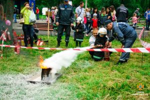 Рятувальники пропонували всім спробувати себе в різноманітних завданнях. Маленькі відвідувачі роздивлялися пожежно-рятувальні автомобілі, одягали бойове спорядження і, за допомогою водяного ствола і вогнегасника, вчились гасити умовні пожежі.