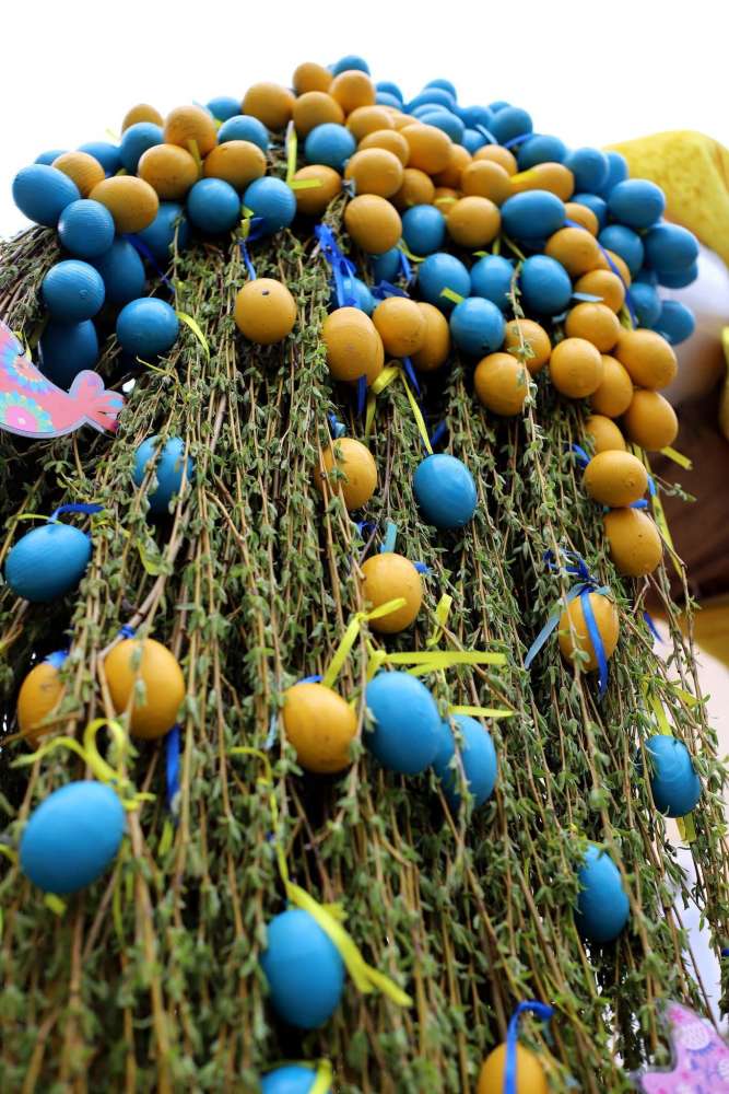 Серед прикрас – великі декоративні великодні писанки, кошики, крашанки та квіти.