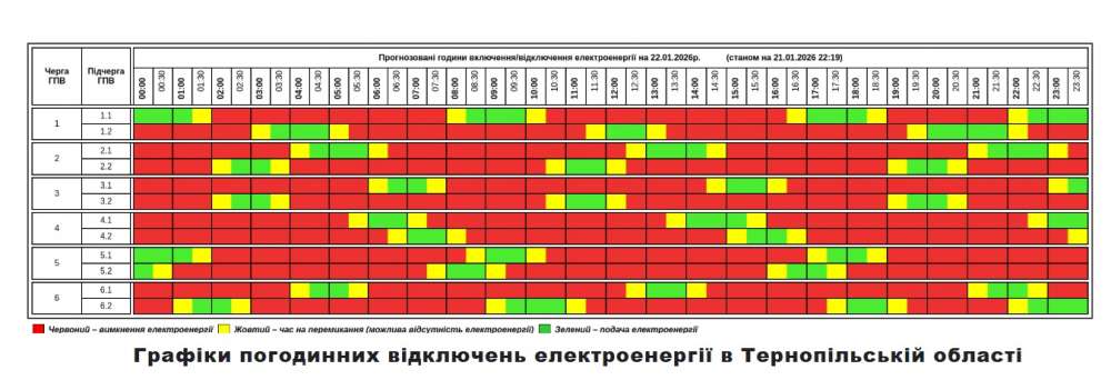 Згідно вказівки НЕК “Укренерго” 2026-01-22 на території Тернопільської області діятиме Графік погодинних відключень (ГПВ).