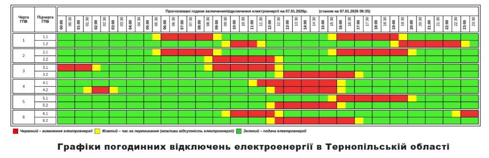 Відповідно до вказівки НЕК «Укренерго», 07 січня 2026 року на території Тернопільської області буде застосовано Графік погодинних відключень електроенергії (ГПВ).