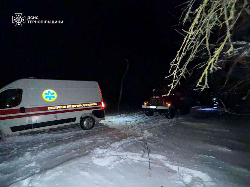 «О 18 годині в селі Млинки Золотопотіцької громади відбуксирували авто швидкої, в якому перебувала хвора малолітня дитина. Допомогу надали чотирьом людям. О 22:38 відбуксирували авто швидкої допомоги в селі Велика Плавуча Зборівської громади. Вночі 9 січня, о 2 годині, в селі Іване-Пусте Чортківського району відбуксирували ще один автомобіль швидкої зі снігового замету та доставили фельдшера до місця виклику», – йдеться у повідомленні рятувальників.