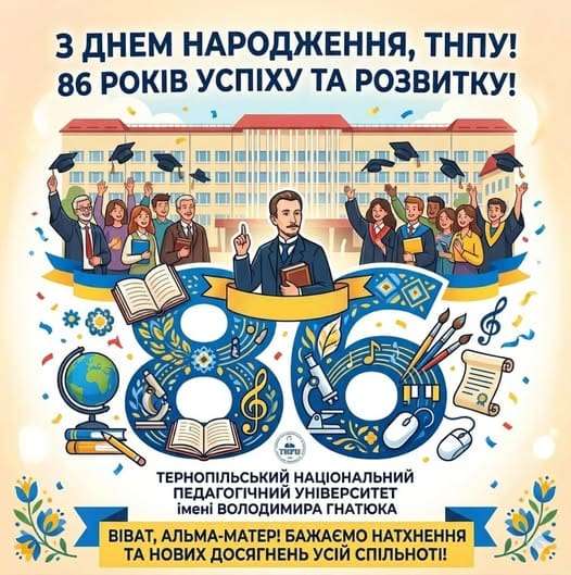 Тернопільський національний педагогічний університет імені Володимира Гнатюка (ТНПУ) відсвяткував 86 років від дня заснування. Цьогорічна річниця стала символом згуртованості: заходи поєднали академічні урочистості, благодійні ініціативи на підтримку армії та глибоку шану до полеглих захисників України. Про це виданню ГОЛОС повідомили в Тернопільській ОВА, міській раді та пресслужбі вишу.