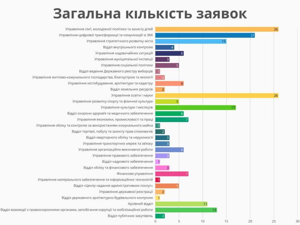У міськраді розповіли, що найбільше заявок на стажування надійшло до управління сім’ї, молодіжної політики та захисту дітей, а також до управління освіти і науки – по 26 у кожне.