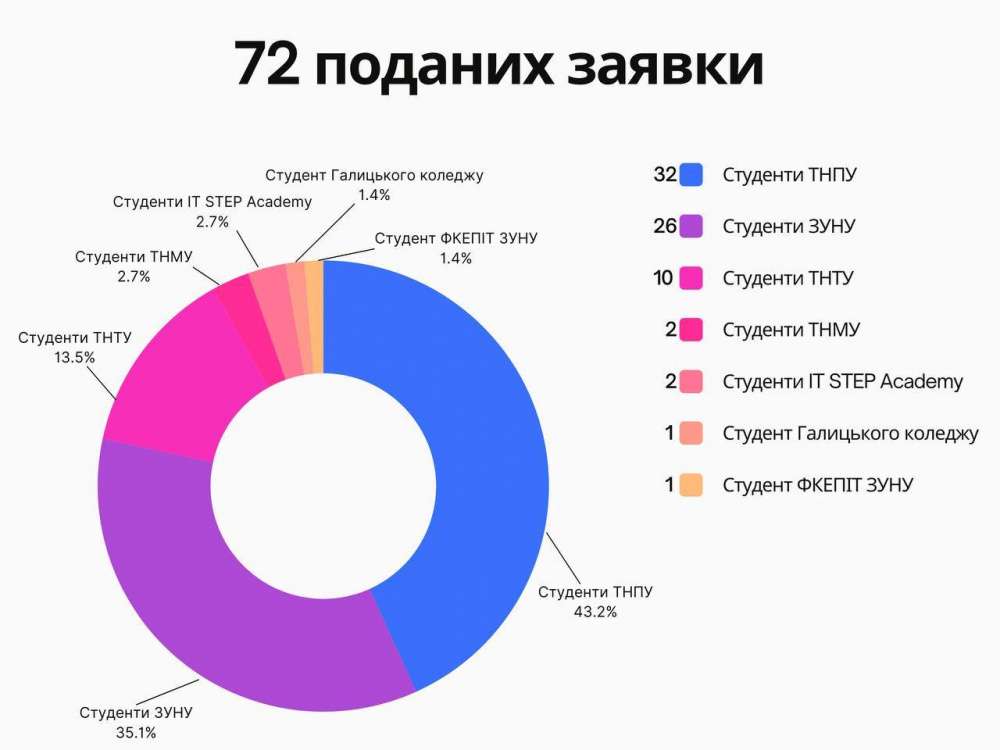 «Найактивніше долучилися студенти ТНПУ ім. В. Гнатюка, які подали 32 заявки. Також значний інтерес проявили представники ЗУНУ – 26 заявок та ТНТУ ім. І. Пулюя – 10 заявок. Окрім цього, серед кандидатів є студенти ТНМУ, IT STEP Academy, Галицького коледжу та ФКЕПІТ ЗУНУ», – йдеться у повідомленні.
