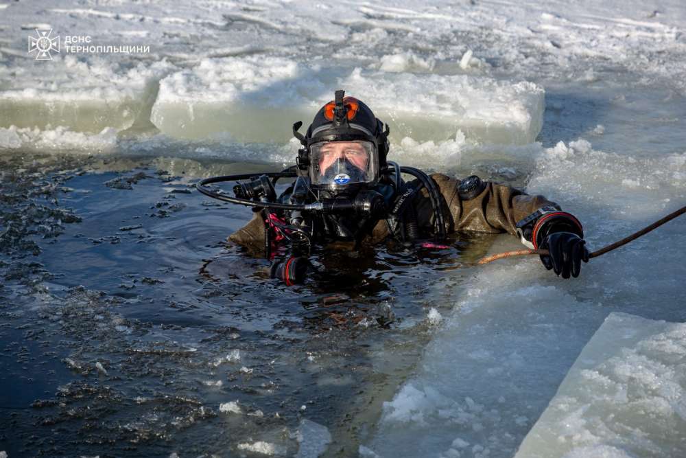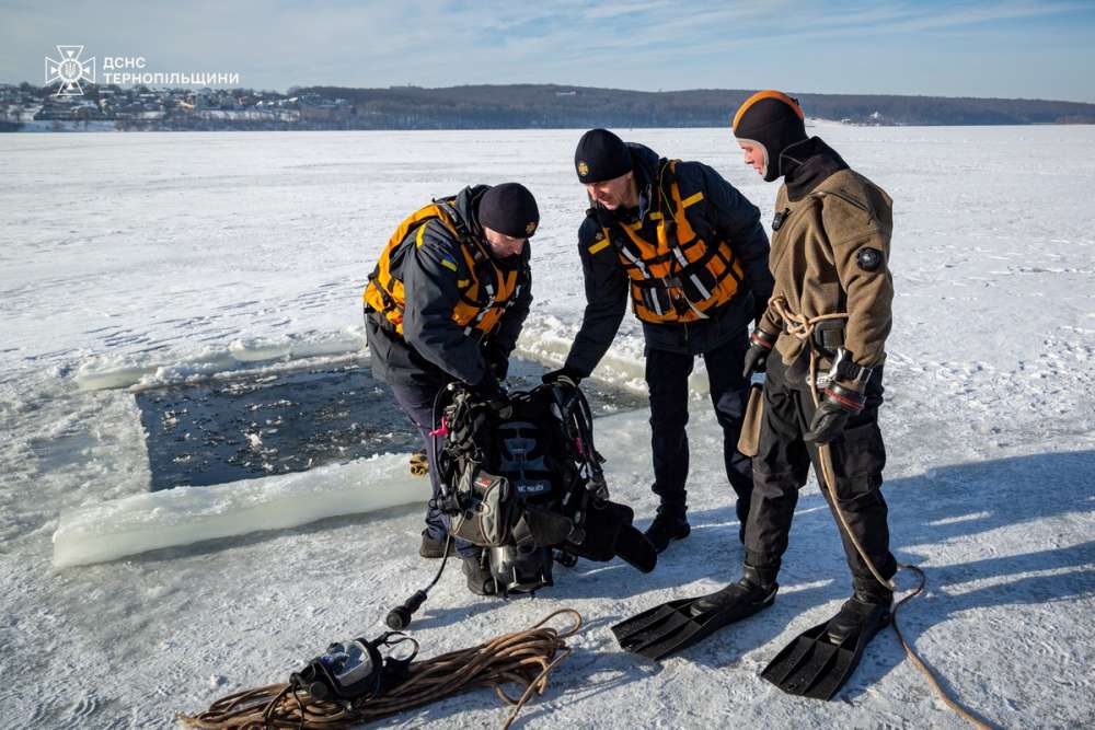 Рятувальники відпрацьовують порятунок людей з-під замерзлої водойми. На Тернопільському ставі провели планові навчально–тренувальні занурення водолазно–піротехнічного підрозділу ДСНС Тернопільщини.