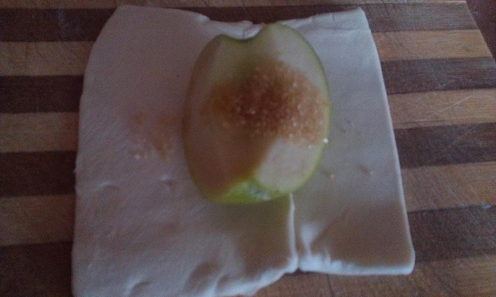 4. Якщо яблуко невелике, то видалити з нього серцевину і заповнити цукром (я використовувала тростинний і зовсім небагато) , а якщо ви ділите яблуко на частинки, то посипати кожну з них і помістити в центр нарізаних квадратиків тіста.