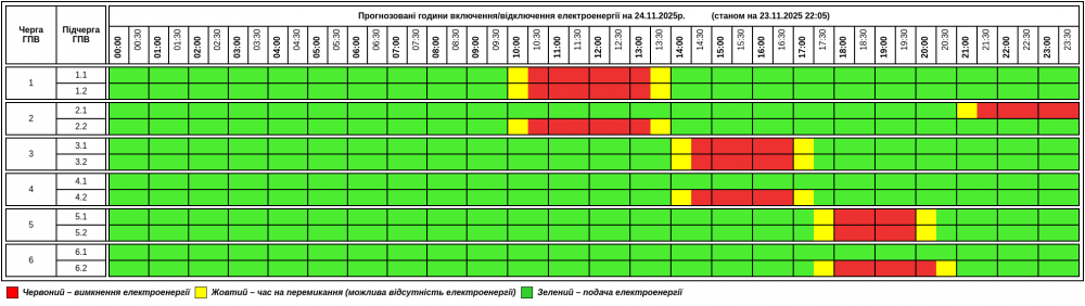 Станом на 19:00 23 листопада графік на 24 листопада має наступний вигляд. Однак в Обленерго зазначили, що він може змінюватися.