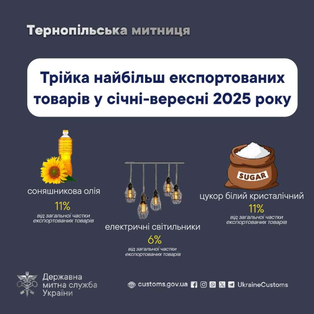 У січні-вересні цього року працівники Тернопільської митниці оформили понад 17 357 експортних декларацій. Завдяки цьому загальний обсяг товарів, вивезених за кордон, перевищив 463 тисячі тонн, а їхня вартість сягнула понад 580 мільйонів доларів США.