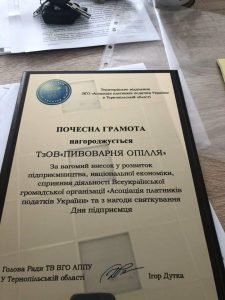 Тернопільське відділення ВГО «Асоціація платників податків України» за вагомий внесок у розвиток підприємництва національної економіки нагородило Почесною грамотою сумлінного платника податків – ТзОВ «Пивоварня Опілля».