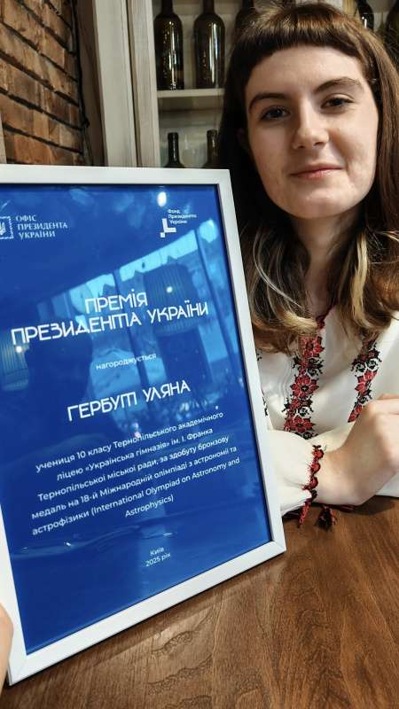 «Уляна отримала сертифікат на здобуття премії Президента України. Із цим досягненням тернополянку особисто привітав Володимир Зеленський. Вручення сертифікату відбулося у Києві під час урочистої зустрічі Глави держави з педагогами та активною молоддю країни. Уляна отримала президентську премію як переможниця міжнародної учнівської олімпіади», – йдеться у повідомленні.