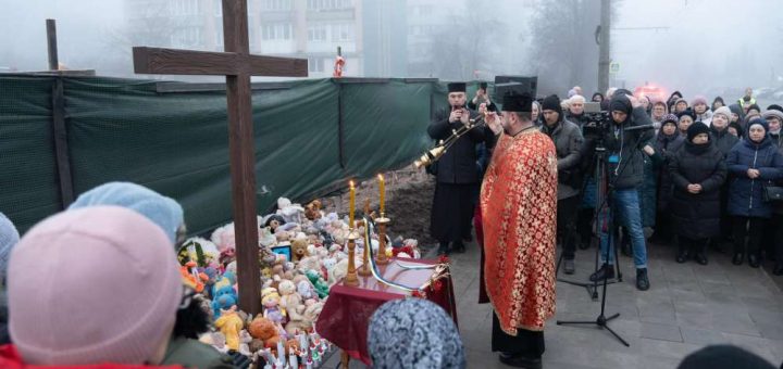 Освячення пам’ятного хреста на місці зруйнованого будинку. Фото ТОВА