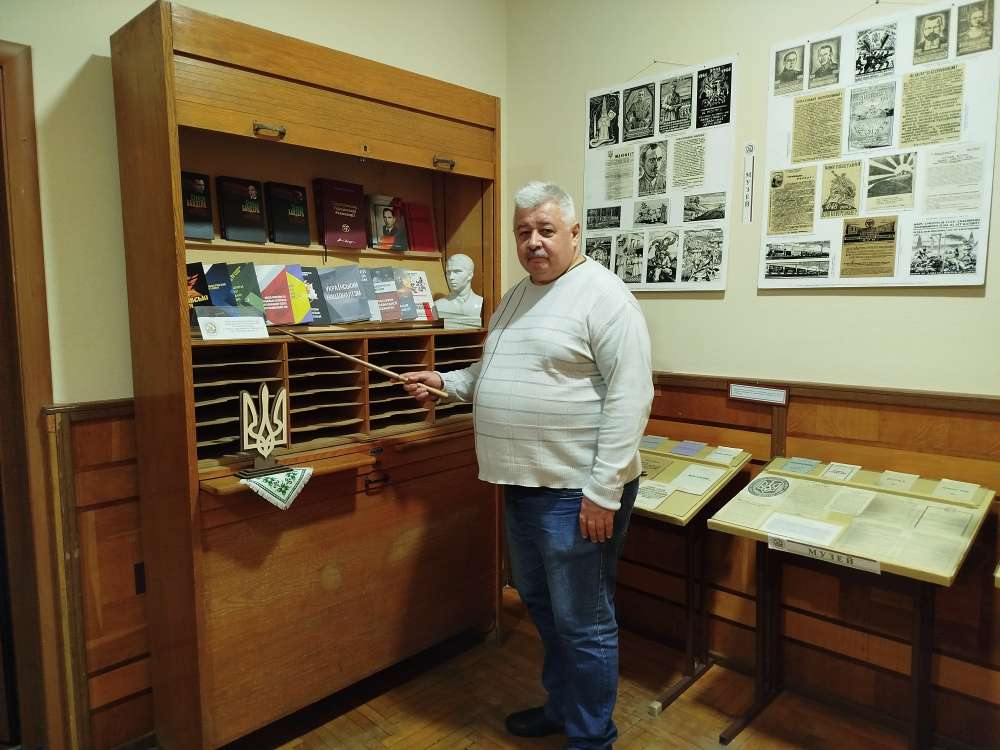 Євген Філь показує шафу-бюро Степана Бандери. Фото Суспільне Тернопіль
