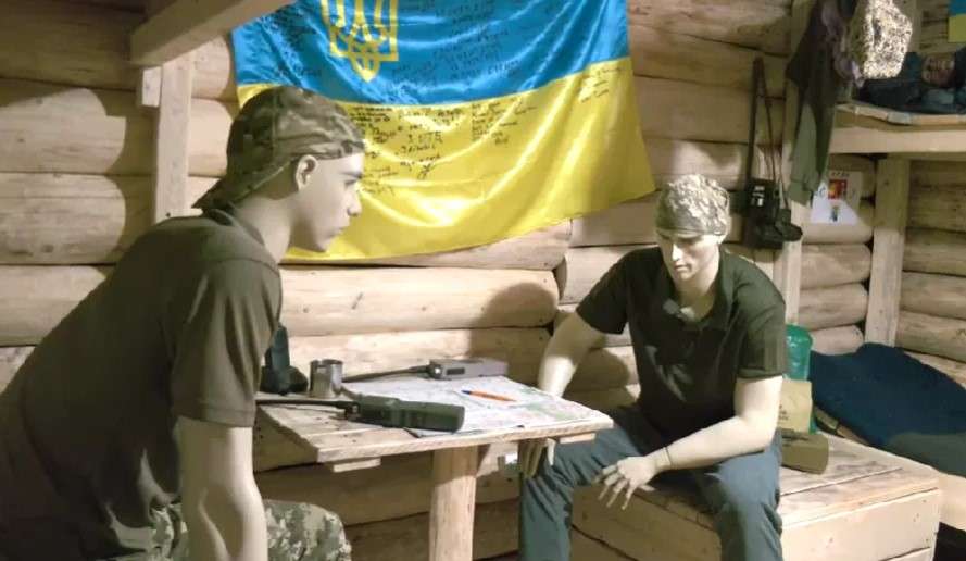 У бліндажі — манекени українських військових у повному екіпіруванні, зброя, побутові речі. Один із солдатів — у спортивних штанах і тапочках, інші схилилися над картою чи розглядають радіостанції. На мотузці сушиться одяг, поряд стоїть справжня фронтова буржуйка — лопнута, але відновлена для експозиції.