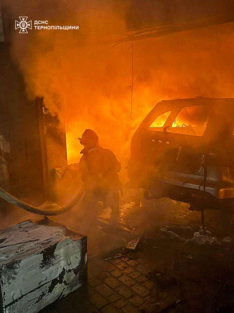 У м. Збараж пожежа виникла у господарській будівлі (30 м²). Вогнем знищено гараж та автомобіль Honda CR-V. Врятовано 1 будівлю.