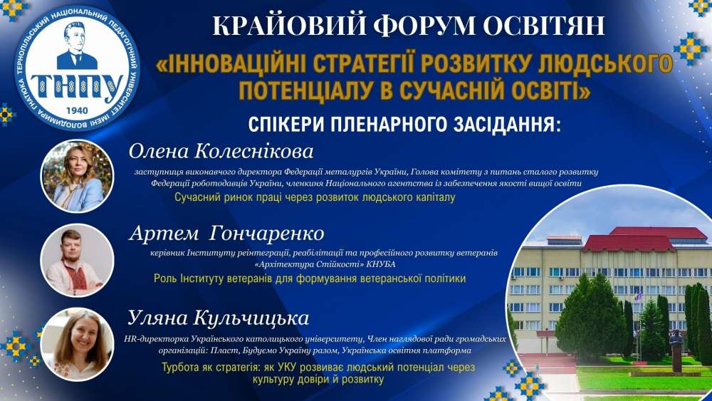 19 жовтня 2025 р. Тернопільський національний педагогічний університет імені Володимира Гнатюка запрошує на сьомий Крайовий форум освітян: «Інноваційні стратегії розвитку людського потенціалу в сучасній освіті».