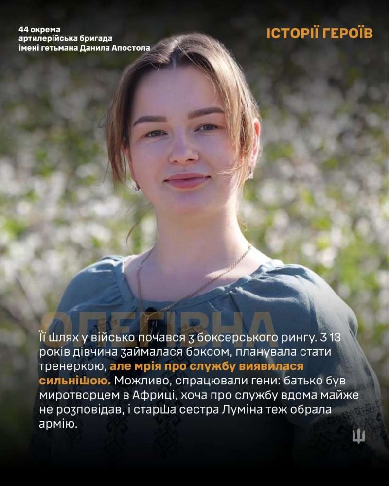 Невдовзі прийшов лист із Національної академії сухопутних військ імені гетьмана Петра Сагайдачного. У Львові фізичну підготовку вона склала бездоганно. У 2020 році Олегівна стала курсанткою напрямку морально-психологічного забезпечення. За чотири роки навчання вона встигала все: бути журналісткою курсу, тренуватися та виступати на чемпіонатах України з боксу.