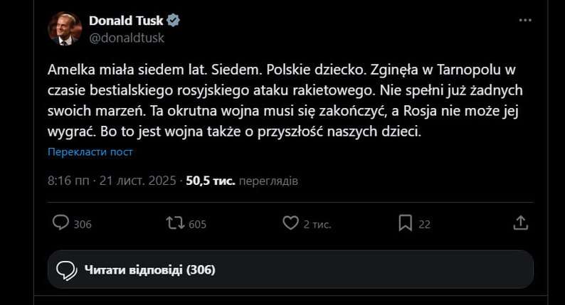 «Амельці було сім років. Сім. Польська дитина. Вона загинула в Тернополі під час жорстокого ракетного нападу Росії. Вона ніколи не здійснить жодної зі своїх мрій. Ця жорстока війна має закінчитися, і Росія не може її виграти. Бо це також війна за майбутнє наших дітей», – написав Дональд Туск.