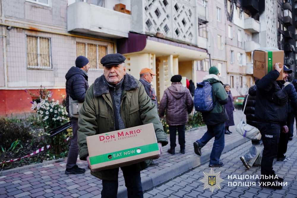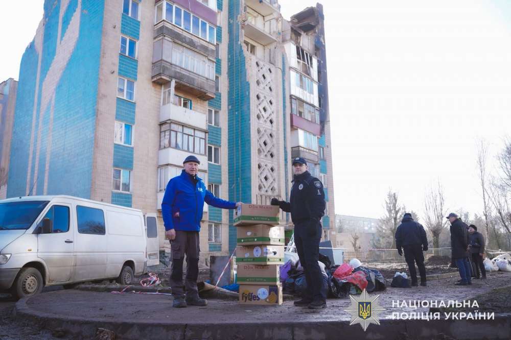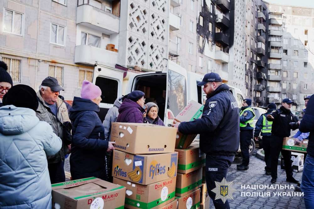 Волонтери і правоохоронці роздають гуманітарну допомогу постраждалим від обстрілів