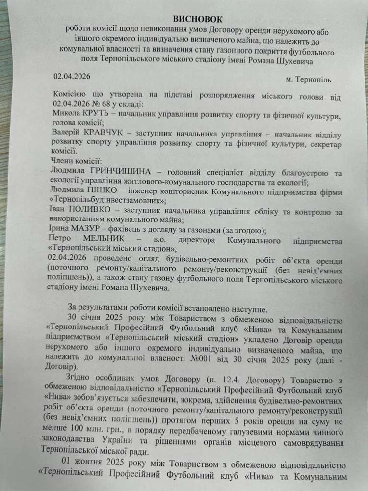 31 березня 2026 року клуб надсилає офіційний лист міському голові: «Орендар має намір припинити дію Договору оренди шляхом його розірвання за взаємною згодою сторін». Підпис, печатка, вихідний номер.Інвестори стверджують, що міська влада безпідставно не погоджуються проведення футбольних матчів. Але факти вперта річ – підстави є три – відсутність договорів щодо укриттів (і це в той час, коли Тернопіль під час обстрілу 19 листопада 2025 року втратив більше 40 невинних життів), незадовільний стан газону (висновок комісії з фахівцем), проведення попереднього матчу без дозволу. Лист «інвесторів» ігнорує всі три.